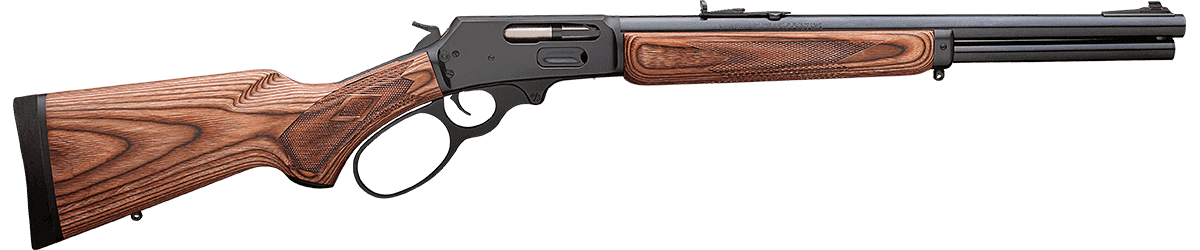 • Lever action with big-loop finger lever; side ejection; solid-top receiver; deeply blued metal surfaces; hammer block safety