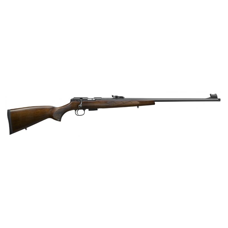 A rimfire rifle with a classic European hunting rifle design. The varnished stock with cheekpiece is made of high-quality Turkish walnut and features laser-etched checkering. Traditional iron sights come as standard.
