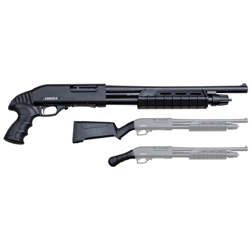 The Canuck Enforcer 12ga Pump-Action Shotgun with a 4-round capacity comes with an ergonomic, ridged forend and a rubberized pistol grip for added purchase and minimal slippage on the firearm while shooting.