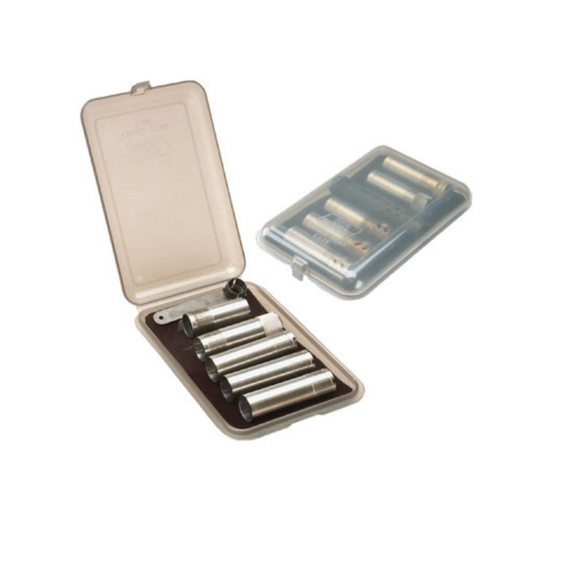 Hard case protection of your valuable shotgun chokes. Clear lid lets you easily see which chokes you have. Made of rugged polypropylene, with two internal dividers, that protects the delicate threads from banging into other chokes. The Velour foam pad helps prevent rattle.