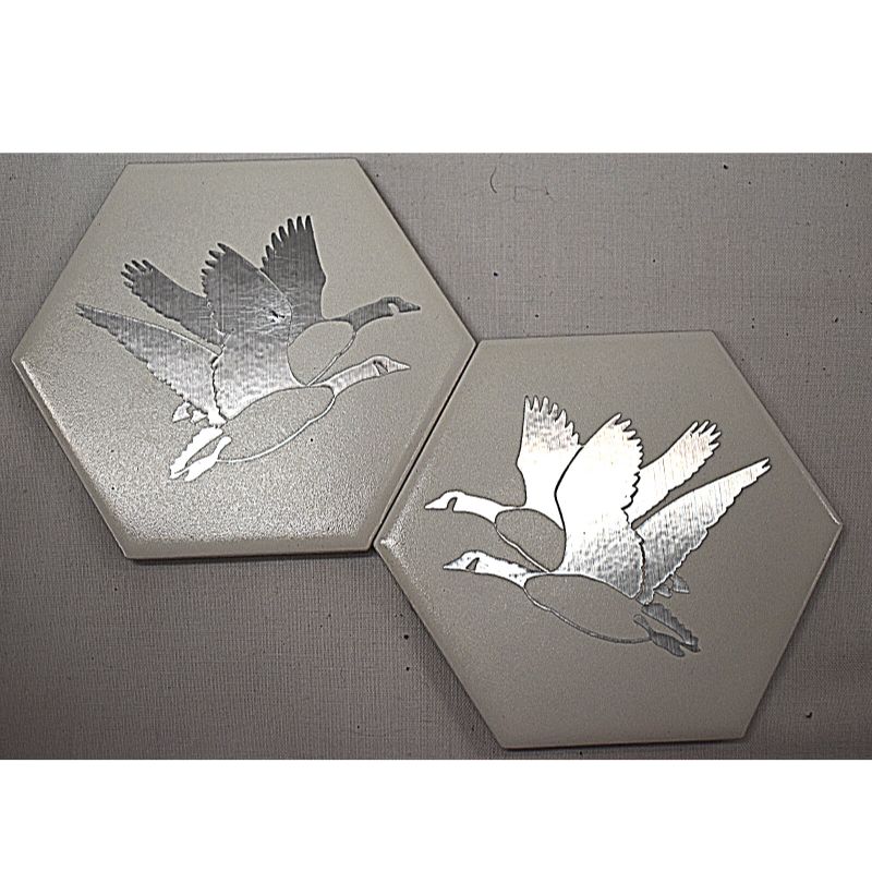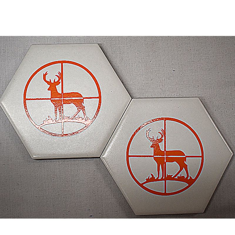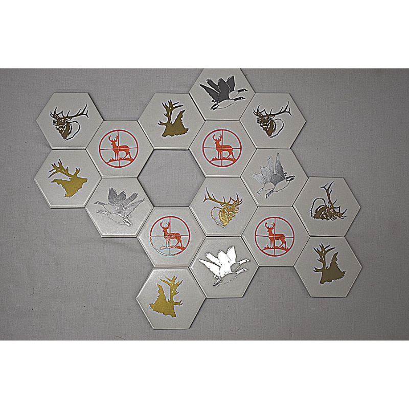 - Imprint: Orange Deer in crosshairs, Gold Elk Silhouette Outline, Gold Elk Silhouette Solid, Silver Goose Pair in Flight, Black antler game scene, Black mallard duck in flight
