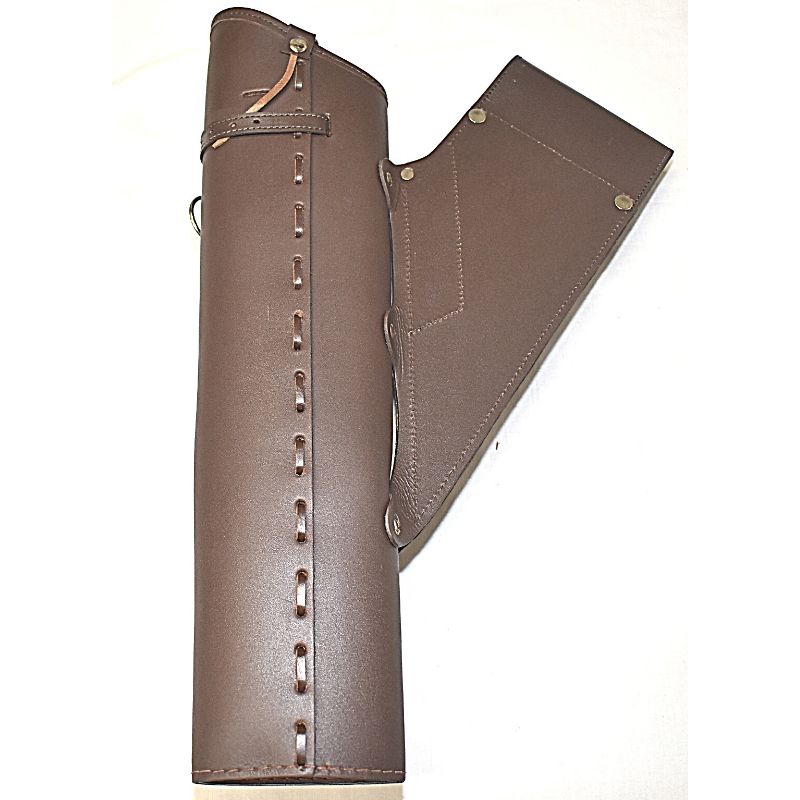A cowhide hand stitched leather side quiver, with 3 pockets, belt loop flap and size closure pockets.
