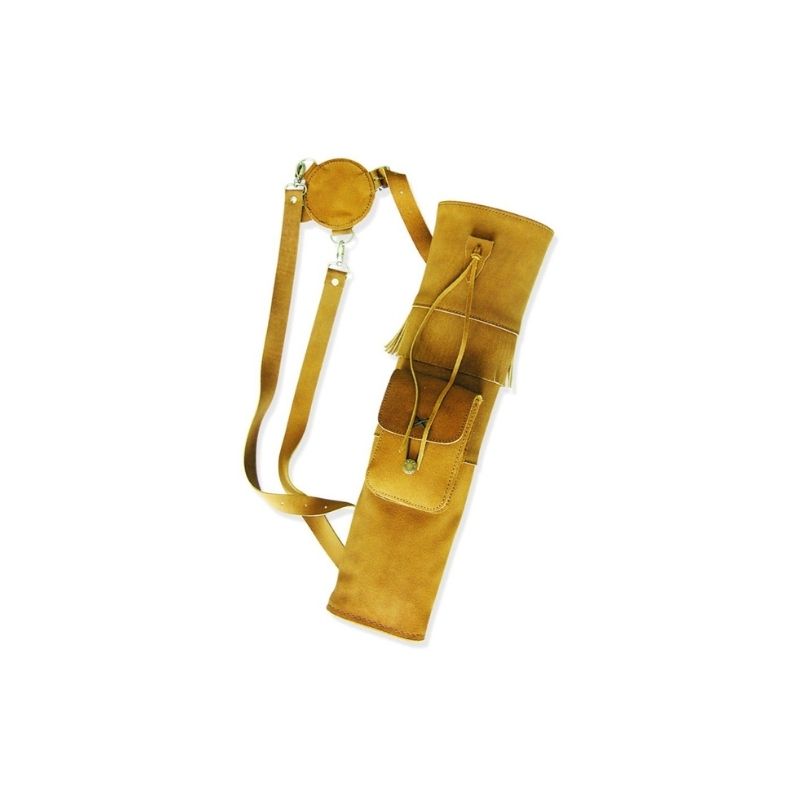 A tampered cowhide suede back quiver, with accessory pocket (with flap), adjustable “Y” belts.