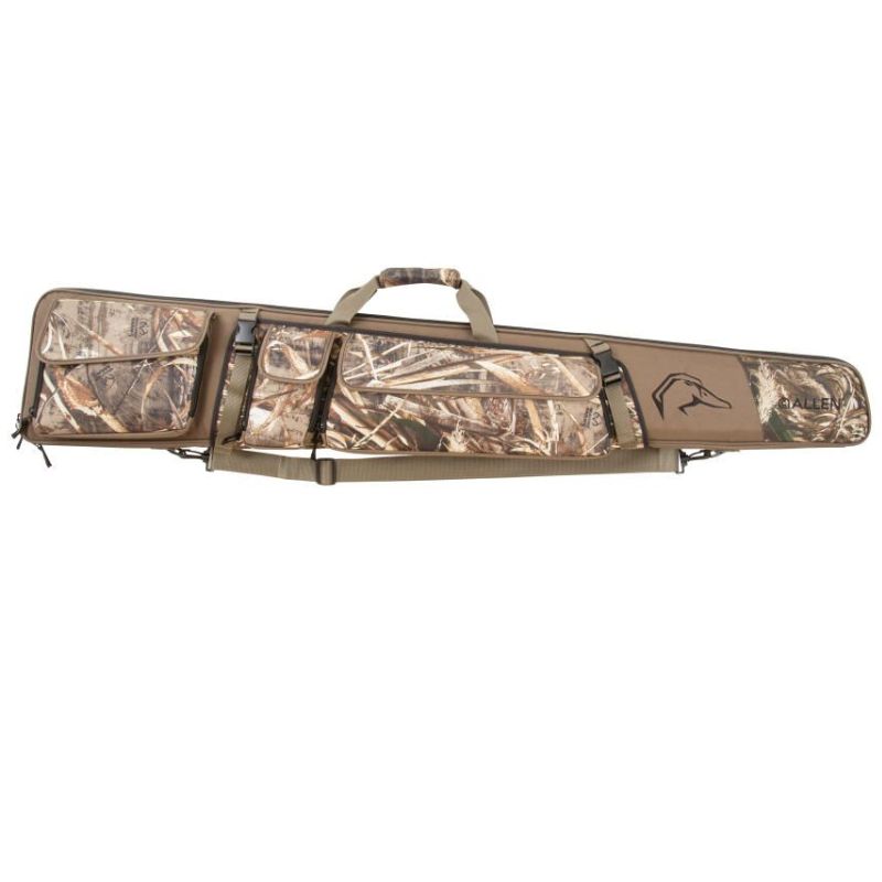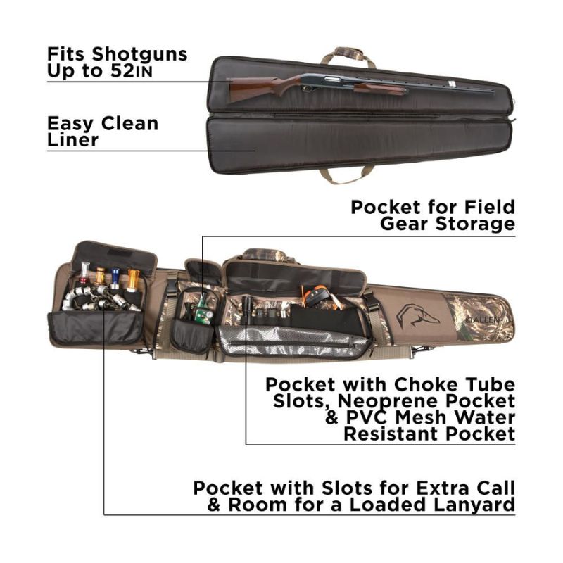 Waterfowl season awaits with the Gear Fit Pursuit™ Punisher™ Shotgun Case. Purpose-driven and designed so you can bring all your Waterfowl hunting essentials with you, from calls and choke tubes, to dog training gear and more. Made with RealtreeĀ® MAX-5™ camo, the case fits shotguns up to 52-inches and features two gear storage flaps and three zippered pockets designed for what you bring to the hunt. The main front pocket has a weatherproof storage pocket, four large elastic loops, and a stretch-fit pocket for storing larger items. The center pocket was designed to hold field gear, such as your rangefinder and compass. The rear pocket is designed to hold 4 calls and your lanyard. This case also features the innovative Gear Fit™ quick-connect straps, which allow you to bring large items, like your jacket or dog vest. The inside of the case has heavy-duty, dual-density foam for ultimate protection. The lining is easy to clean, and the oversized zippers make it easy to open and close. includes a detachable, adjustable shoulder strap. The Gear Fit Pursuit™ Punisher™ Shotgun Case is highly water-resistant and can float for a limited time with a firearm and appropriate amount of gear stored properly in the case. This case is not to be used as a flotation device please exercise caution and safety when hunting near water.
