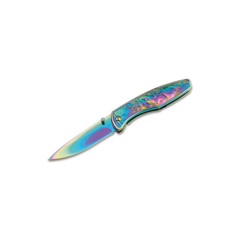Whether on prehistoric murals, in Greek antiquity, Celtic folk tales, the German Middle Ages, the Renaissance or the Brothers Grimm: the unicorn seems to be a primal longing of people, whose childlike fascination they cannot escape even in adulthood. The Magnum Anna’s Rainbow Unicorn is a classic framelock pocket knife with a removable thumb stud on both sides. The fairytale stainless steel handle has a pronounced unicorn relief on one side. The colourful drop point blade is made of 440A stainless steel and, like the handle, has an exciting rainbow finish. With clip (tip-up/r).
