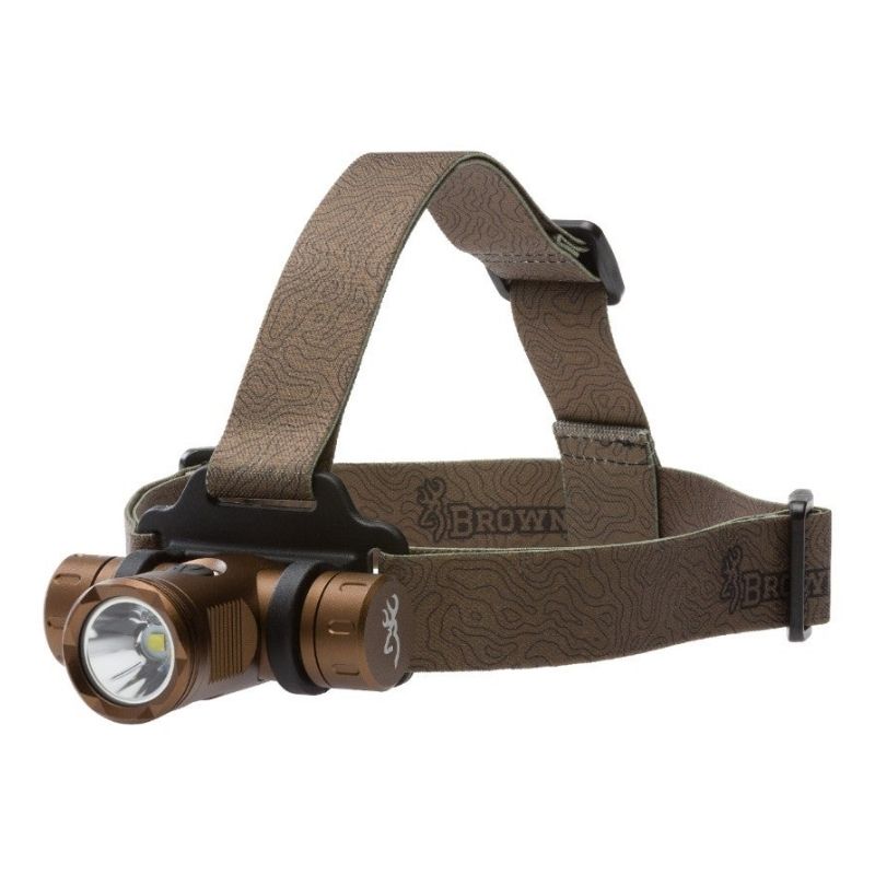 Rugged LED headlamp with robust aluminum housing and durable bronze anodized finish. High, medium and low white beam modes plus low green mode. Dual Fuel operation uses included rechargeable Li-ion battery or two CR123 batteries. Silent, secure hinge design and comfortable elastic head strap.