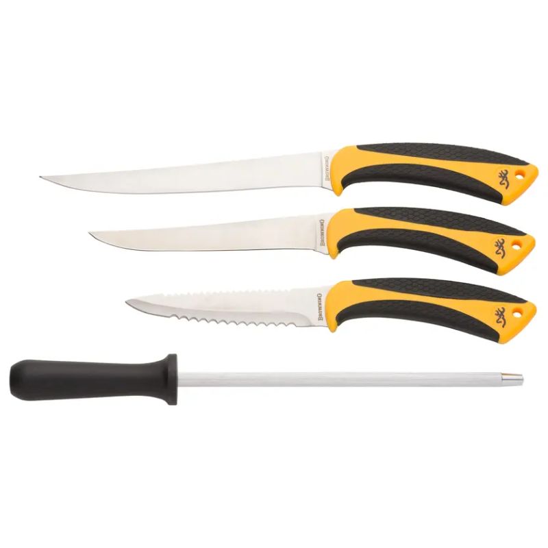 The Browning Fillet Combo is designed to make processing your catch easy. Made from rust-resistant stainless steel with just the right amount of flex for making precise cuts, these fillet knives are designed to glide over bone and through tough scales. Polymer handles are tough and feature soft, textured inserts that provide a sure grip in wet conditions. The included sharpening rod makes edge touch up easy so you barely miss a beat. The knives and sharpening rod all store neatly in a nylon roll sheath.