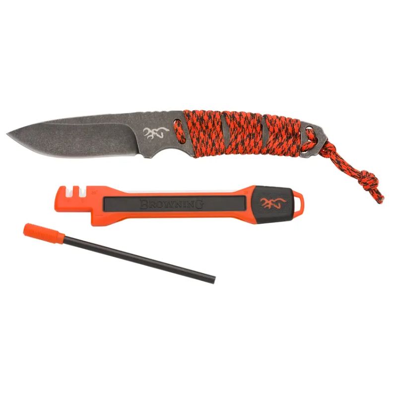 Whether hunting, hiking or in need of a knife that handles any duty when called on, the Last Light Combo is a worthy piece of kit for your belt or bag. The sturdy, one-piece stainless steel design is built extraordinarily tough and the drop point blade shape is highly versatile. The paracord wrapped around the handle can be easily removed to replace a broken shoelace or construct a snare. The included sharpener features a ferro rod for emergency fire starting. The knife and sharpener/ferro rod all fit in the included nylon belt sheath.