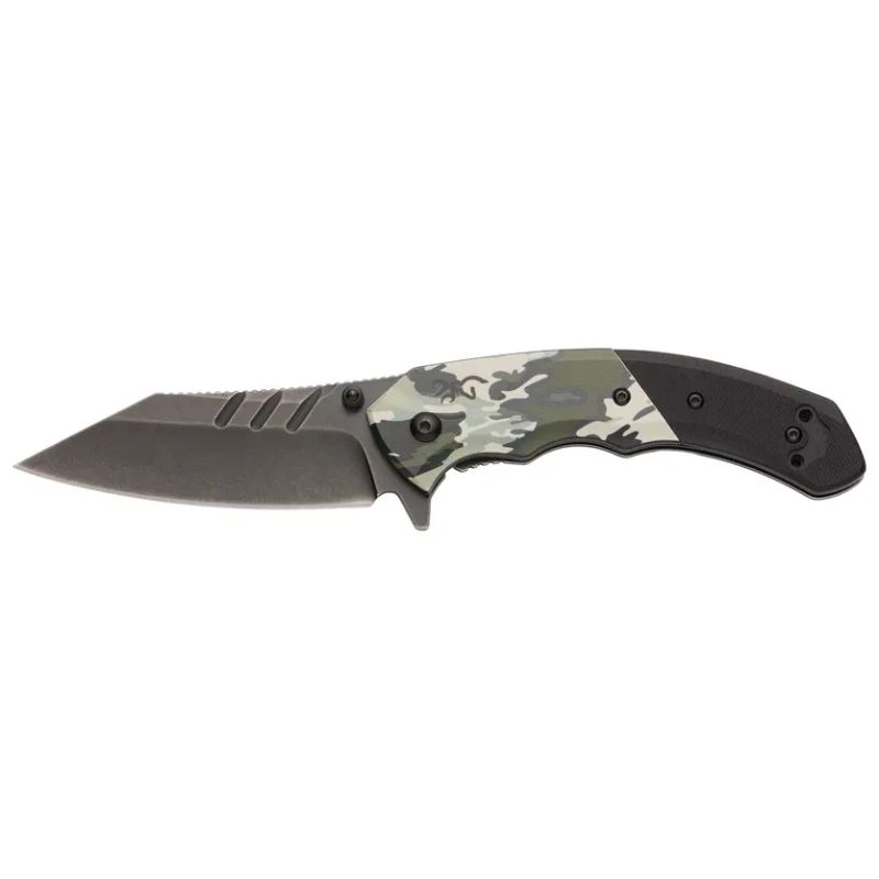 - Black G-10 handle scales with aluminum bolster coated with Browning OVIX™ camo pattern