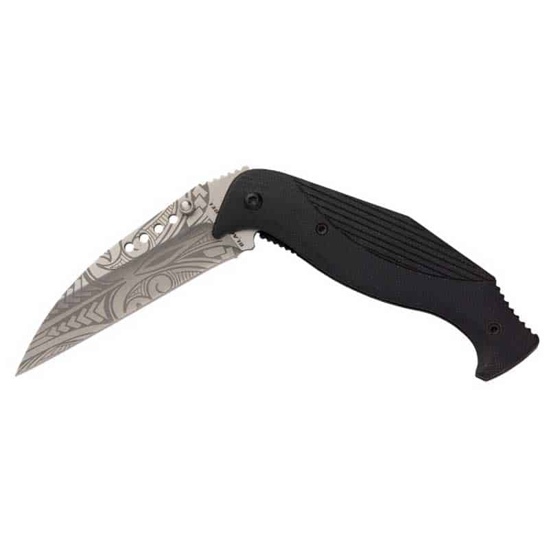 - BLADE: 8Cr13MoV stainless steel; Unique Wharncliffe blade profile; Etched with a Maori warrior tribal motif