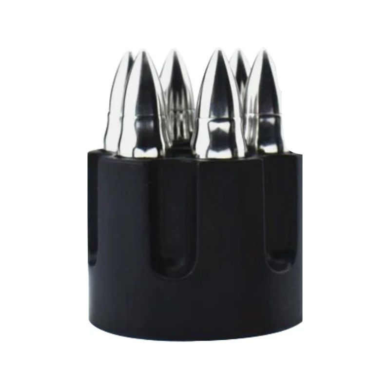 The Caliber Gourmet™ Stainless Steel Bullet Chillers keep your favorite beverages and cocktails frosty cold, without the use of ice. Each bullet is constructed with 304 stainless steel and is guaranteed to be food safe, while remaining free of rust and other contaminates, as well as foreign smells and tastes. Each bullet measures 12mm x 45mm and weighs in at only 11 grams. The 6 bullets are held in a revolver base that fits perfectly in the freezer to keep them cold and ready. These bullets are sure to make a big impression, and serve as the perfect gift for the firearm enthusiast.
