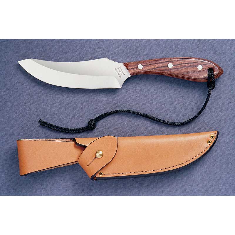Designed for dressing only, large handle for larger hands, available with tab/lock down sheath design with belt loop positioned high enough for comfort while sitting or riding. Other sheath styles also available (same sheaths that fit the survival knife also fit the #100).