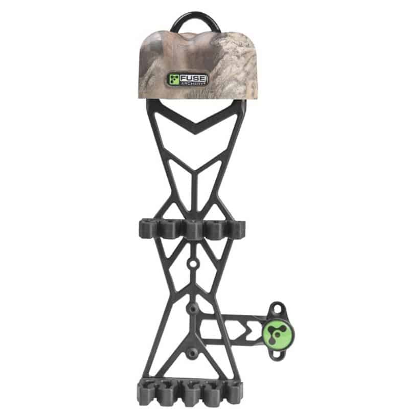 The Fuse Archery Maxxis Arrow Quiver adds strength and silence to your hunt. A durable tree stand hook allows you to silently hang your quiver and a double gripper design secures arrows and prevents them from slipping on the ground. This versatile quiver holds both small and large diameter arrows and features a durable, silent, quick-detach dovetail mounting system.