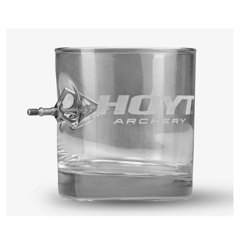 The Hoyt Archery 11 oz. Rocks Glass features an authentic G5 3-blade broadhead embedded directly in the glass!