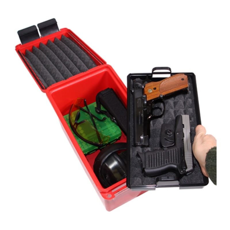 Features a lift out tray with special convoluted foam to protect your handguns. Double latching system prevent accidental opening and help seal the box closed. Two pad lock tabs makes it secure. The large comfortable handle makes it a easy to carry to the range.