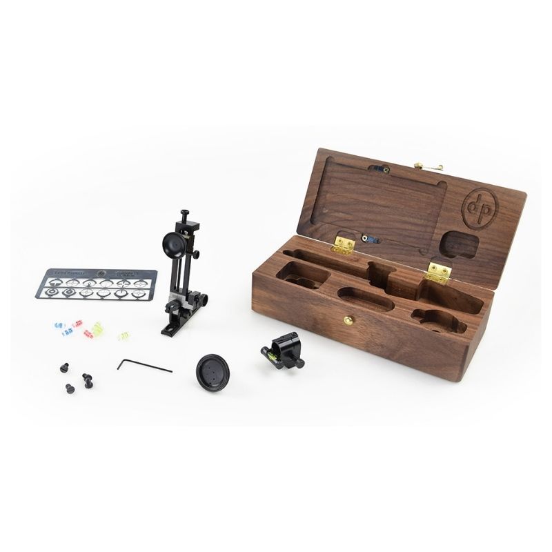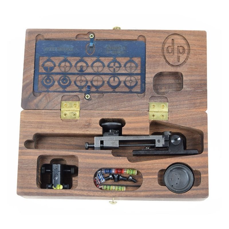 Professional set in treated wooden box consisting of professional Creedmoor sights, tunnel front sight, colored glass bubbles and interchangeable front sight insert set.