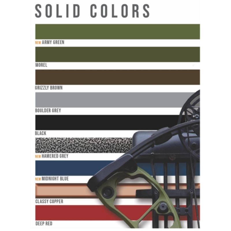 Finishes (Riser/Limb): Army Green, Morel, Grizzly Brown, Boulder Gray, Black, Hammered Gray, Midnight Blue, Deep Red, Classy copper, Optifade Subalpine, Optifade Elevated II, Realtree Excape, Realtree Edge, First Lite Fusion.