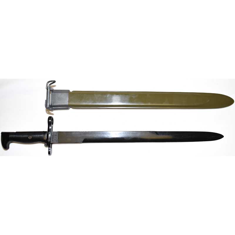 Vintage U.S. Navy Mark 1 Bakelite Training bayonet for use with the U.S. Navy Mark 1 Dummy Training Rifle, made between 1942-43. Comes with a reproduction scabbard. The bayonet design was reverse-engineered from the M1905 bayonet, and is made entirely of sheet steel and hard, black Bakelite plastic. The bayonet is fragile and could not stand up to rigorous use. Most examples encountered today exhibit breakage, however this one is fully intact, with just a slight bend to the blade.