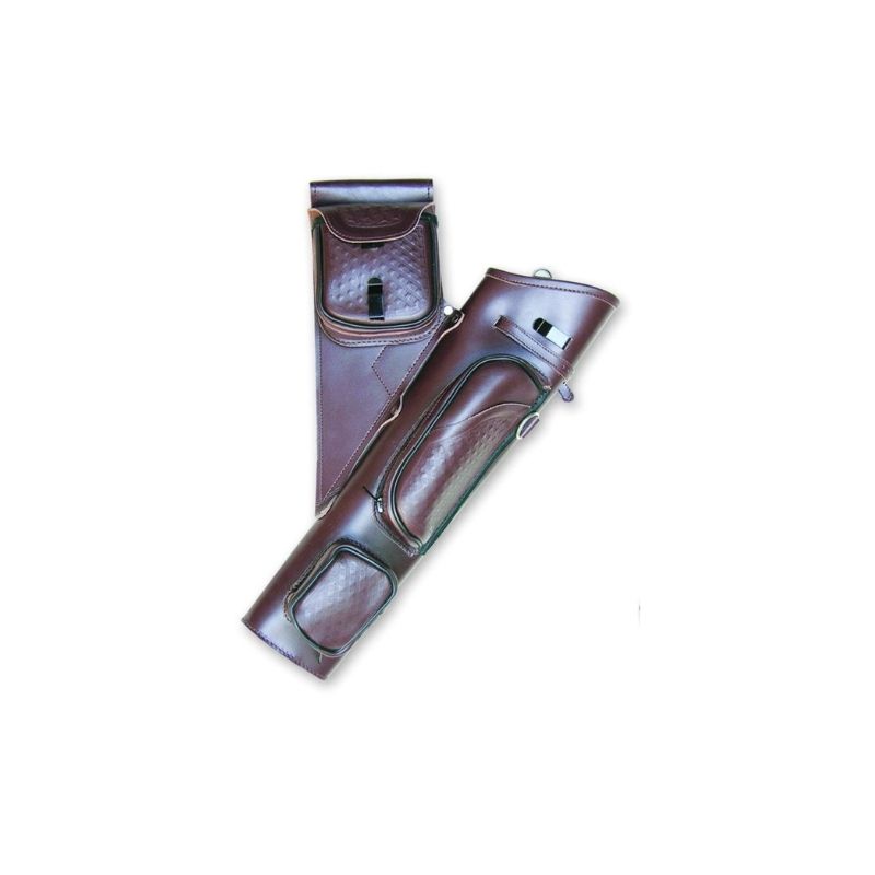 A hand stitched genuine leather cowhide side quiver, with belt loop flap and zip closure