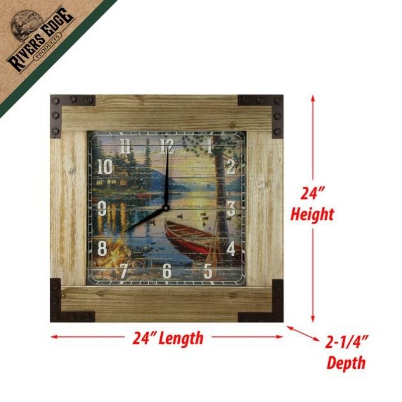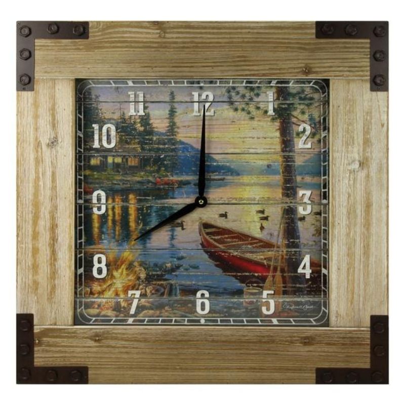 This large wood wall clock from River’s Edge Products is designed to complement rustic decor with its real wood frame and weathered finish. This clock measures 24″ by 24″ square. The clock makes for an impressive focal point on any wall with its 2 1/4″ thick frame and licensed artwork. The clock face features an illustration of a lakeside log cabin with a campfire and red boat while the sun sets against the water. White numbers are easy to read and run along the borders of the clock face. This clock operates on 1 AA battery, which is not included. Decorative rivets adorn each of the clock frame corners to ensure the clock stands out on any wall. Relax and let this wood wall clock keep the time in your home.