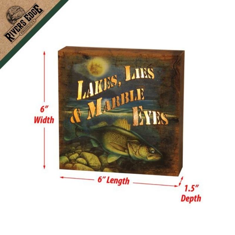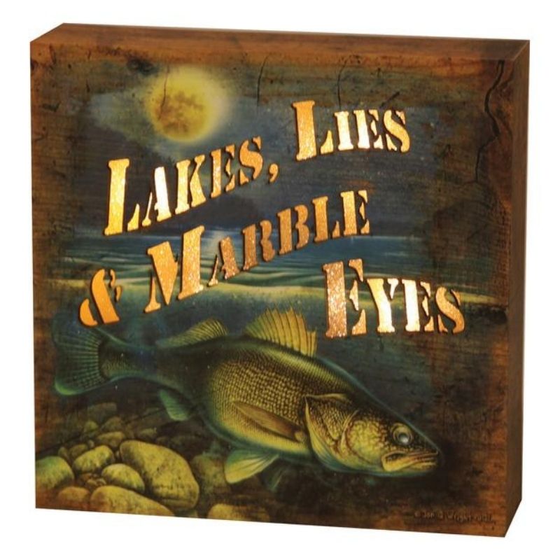 The lake lies marble LED box from River’s Edge Products feature great art and messages that any outdoor enthusiast can identify with. The artwork showcases a walleye sitting on a river bed at night with the lighted message “Lakes, Lies & Marble Eyes.” This sign measures 6″ by 6″ and 1.5″ thick. Also features attractive diffused lighting. The On/Off switch is located on the back and operates on 3 AA batteries, which aren’t included.