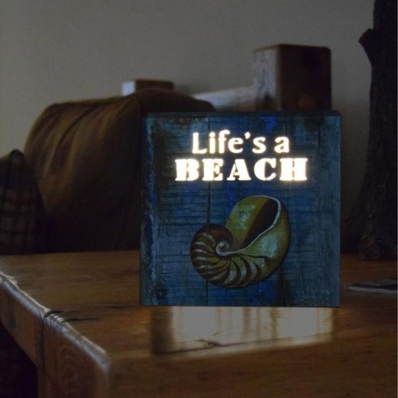 The life’s beach LED box from River’s Edge Products feature great art and messages that any outdoor enthusiast can identify with. The artwork showcases a conch shell with the lighted message “Life’s a Beach.” This sign measures 6″ by 6″ and 1.5″ thick. Also features attractive diffused lighting. The On/Off switch is located on the back and operates on 3 AA batteries, which aren’t included.