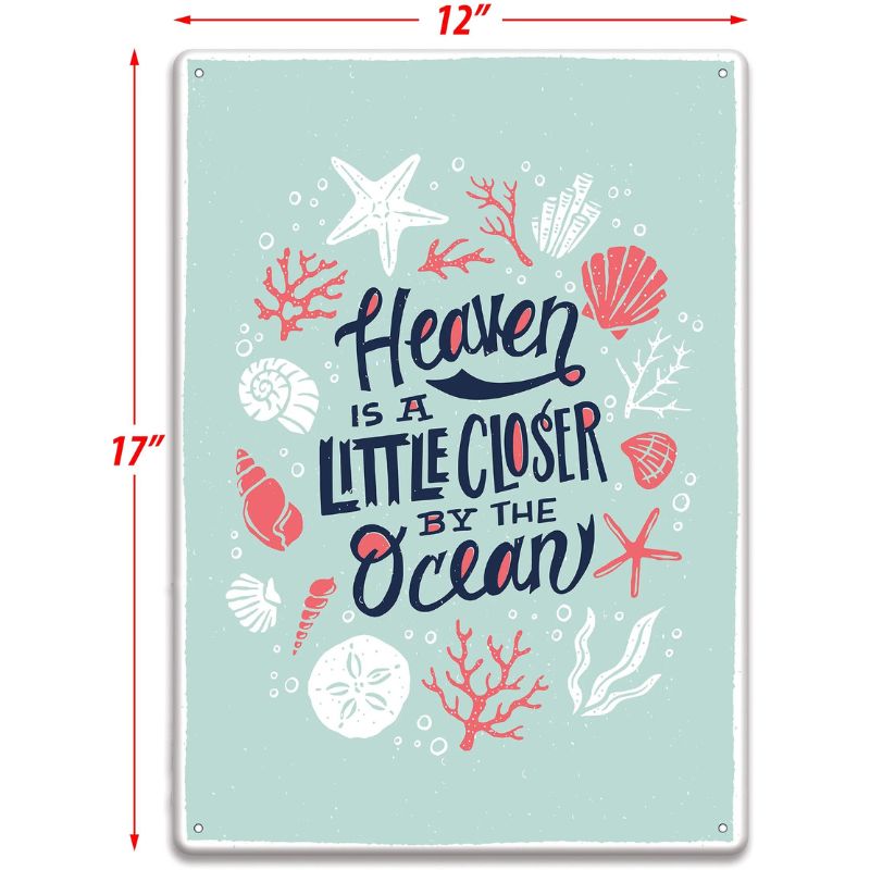 Express your passion for spending time at the ocean! This metal tin sign is ideal wall decor for any beachgoer. This sign features the message ‘Heaven is a Little Closer by the Ocean.’ The artwork features seashells, starfish and corals with cozy light teal color background. Its overall dimension measures 17 inches by 12 inches wide, has rolled edges and pre-punched corner holes for easy wall mounting. A durable weatherproof finish ensures that your sign will be protected from the elements.