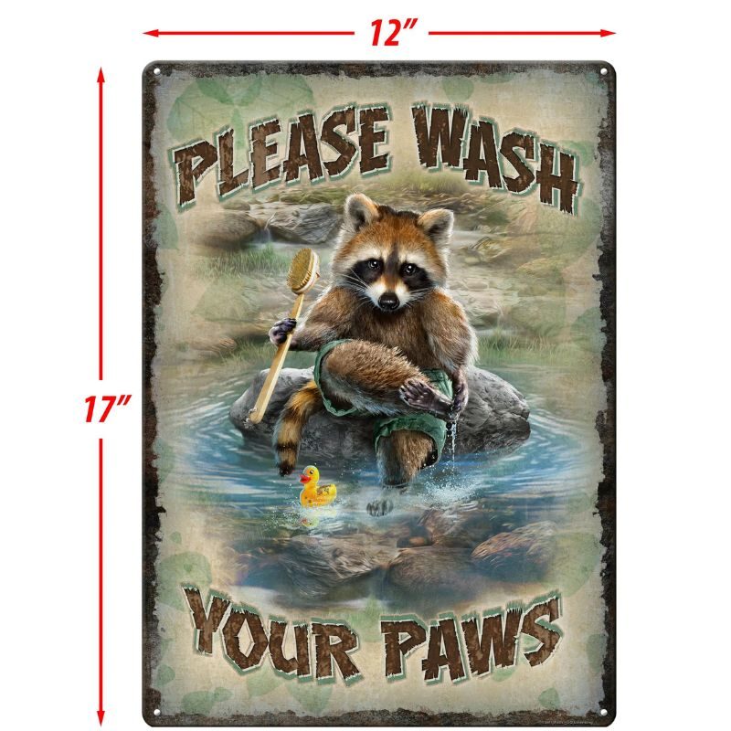 Let them know you would appreciate it if they cleaned their shoes! The sign features the message ‘Please Wash Your Paws’ in stylized, brown capital letters with an illustration of a raccoon washing its feet in a stream with a rubber ducky and scrub brush. The sign is accented by an artificially aged border. Its overall dimension measures 17 inches by 12 inches wide, has rolled edges and pre-punched corner holes for easy wall mounting. A durable weatherproof finish ensures that your sign will be protected from the elements.