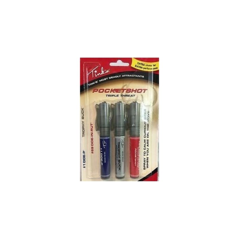 Tink’s most effective attractants and cover scents in handy, compact sprayers that fit in your pocket. Each PocketShot features a clip for keeping it at the ready. Don’t leave home without Tink’s PocketShot Triple threat! 50 shots of mist per PocketShot.