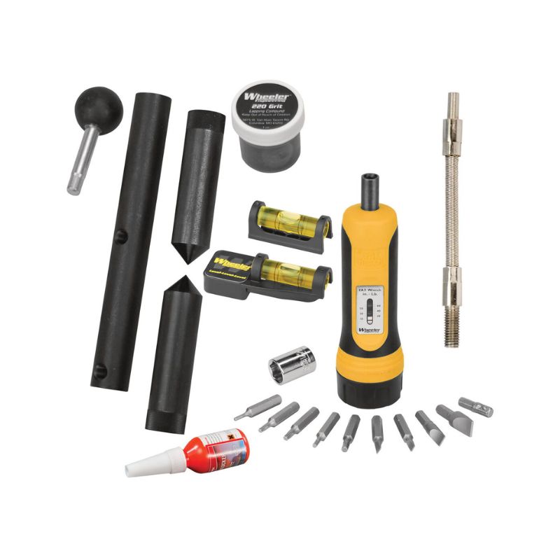 The Wheeler® Professional Scope Mounting Kit and Scope Alignment Kit will properly align, attach and level your scope on your gun. Alignment and lapping bars make ring alignment simple and easy. The Level-Level-Level provides precise linear leveling for your scope and the F.A.T. Wrench® guarantees exact torque specs on your scope rings. A flex driver is included for use with a power drill.