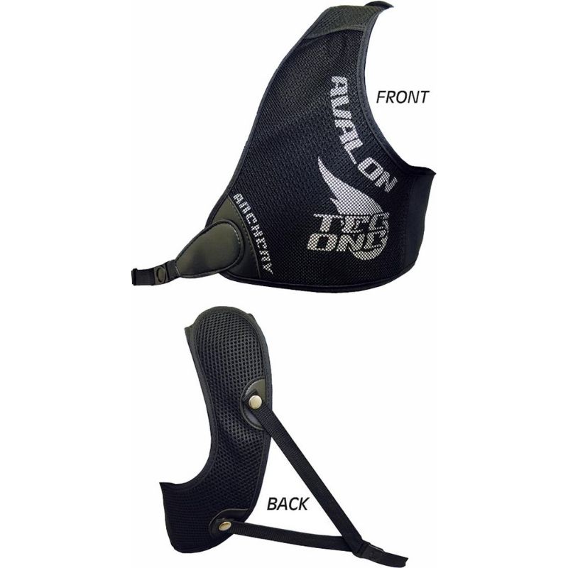 Chest guard from Avalon features a black outer mesh panel with a soft foam padded rear panel sandwiching a central panel. The underarm section joining front to rear is elasticated with adjustable straps. The shoulder section is joined using a large velcro pad which enables quick fastening and removal.