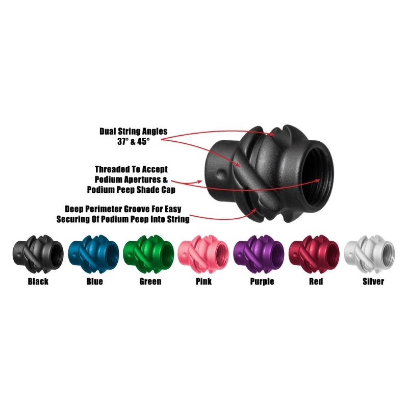 The Podium peep is a machined aluminum peep featuring dual string angle grooves 37 degree and 45 degree and is threaded to accept podium apertures and peeps shade. Center string technology is located in the center of the bowstring for no left and right misses. Protected lens technology keeps your clarifier or verifier protected on both sides.